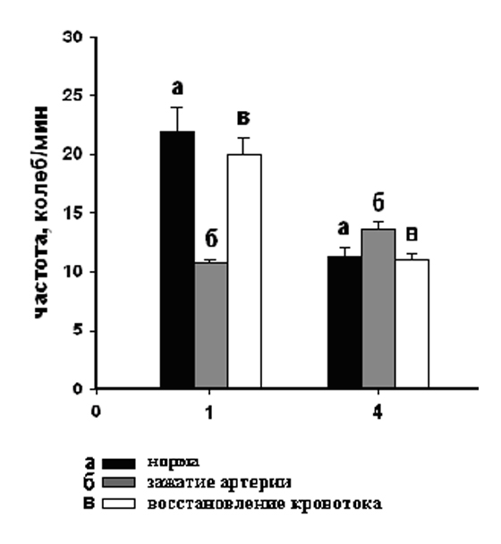 В следующей серии экспериментов изучалось влияние нарушения кровоснабжения почки путем зажатия почечной артерии (a. Renalis) на пейсмекерную активность мочеточника. В течение 8 – 10 мин наблюдалось угнетение активности в околопочечной зоне: уменьшение частоты генеза волн и, соответственно, проходящих спайков (рис. 2, обл. 1, б; табл., обл. 2). В этих условиях отмечается также уменьшение амплитуды волновой активности данной зоны (рис. 3, обл. 1, б). Вместе с тем иная картина наблюдается для характеристик активности околопузырной области: частота медленных волн несколько возрастает – на 2,9 колеб./мин (рис. 2, обл. 4, б), амплитуда также увеличивается – на 76 мкВ (рис. 3, обл. 4, б). Изменения спайковой пейсмекерной активности показаны в таблице: в этих условиях частота увеличивается в 2,2 раза. Последующее восстановление кровотока, как правило, приближает показатели активности к норме (рис. 2 и 3). Таким образом, приведенные результаты косвенно могут служить подтверждением автономности пейсмекерной активности исследуемого нами дистального отдела мочеточника крысы. Однако данный факт никак не исключает определенного влияния основного околопочечного автоматизма на функциональную активность дистальных пейсмекеров.