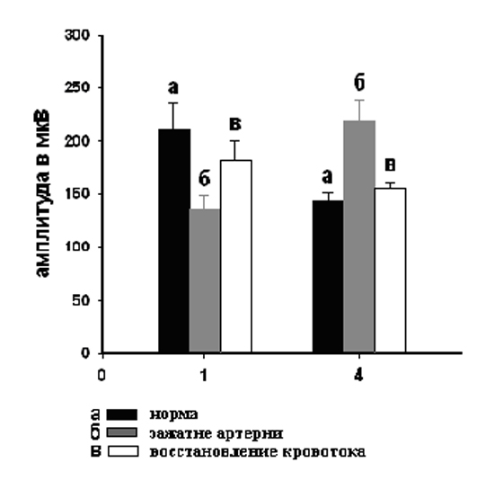 Рис. 3. Влияние кровоснабжения на амплитуду спонтанной медленноволновой активности околопочечной и околопузырной областей мочеточника.