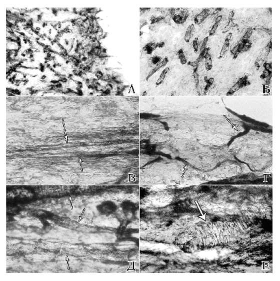 Рис. 4. Микрофотографии продольных срезов околопузырной области (А–Б), срединного отдела (В–Г) и пиелоуретерального соустья (Д–Е) мочеточника интактных крыс (стрелки – кровеносные сосуды внутриорганного микроциркуляторного русла). Кальций-аденозинтрифосфатный метод Чилингаряна. Ув.160 (А, В, Г); 400 (Б, Д); 1000 (Е)