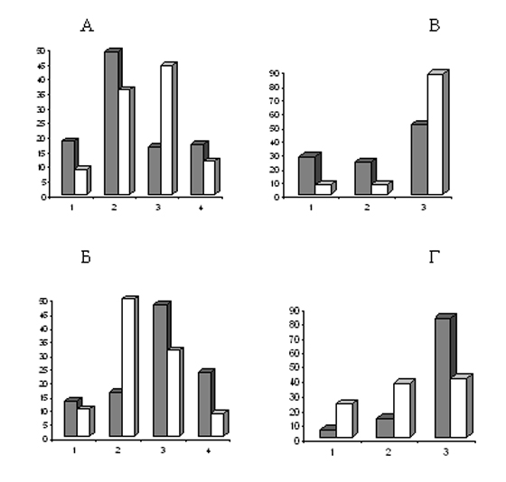 Примечание: А – распределение по степени регулярности; Б – распределение по динамическим типам; В – распределение по модальности гистограмм межимпульсных интервалов; Г – распределение по частотным интервалам; F – средняя частота разрядов нейронов; CV – коэффициент вариации межимпульсных интервалов; As – асимметрия гистограммы межимпульсных интервалов; Ex – эксцесс гистограммы межимпульсных интервалов; Mo – мода гистограммы межимпульсных интервалов; P – вероятность моды гистограммы межимпульсных интервалов; I – индекс отличия фоновой импульсной активности сравниваемых серий экспериментов.