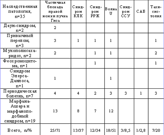 Электрокардиографические феномены у пациентов с наследственной патологией на фоне деформации грудной клетки и искривления позвоночника (абс/%)