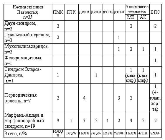 При ЭхоКГ исследовании у пациентов выявлены следующие феномены, характерные для соединительнотканой дисплазии сердца – малые аномалии развития сердца: пролапс митрального и трехстворчатого клапанов суммарно в 48,5% случаев, дополнительные трабекулы в 23% случаев, дополнительные хорды в полостях желудочков в 45% случаев, нередко эти проявления у пациентов сочетались, в частности, у больных с ВПС. В настоящее время зарегистрирован ген аутосомно-доминантного миксоматозного ПМК, который локализован в хромосоме 16р.11.2-12.1 [7] (табл. 2).