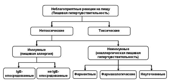 Согласно пересмотренной номенклатуре Европейской академии аллергологии и клинической иммунологии (EAACI) и Всемирной аллергологической организации (WAO), все неблагоприятные реакции на пищу входят в понятие пищевой гиперчувствительности (ПГ). Строго говоря, термин пищевая аллергия следует использовать, когда процесс протекает при участии иммунологических механизмов, включающих как IgE-опосредованные, так и не IgE-опосредованные реакции. В подавляющем большинстве случаев аллергическая гиперчувствительность или иммунные реакции к пище, часто именующиеся истинной пищевой аллергией, связаны с IgE-опосредованными механизмами. Все другие реакции, которые многими специалистами называются пищевой непереносимостью или ложной пищевой аллергией (пищевая псевдоаллергия), следует относить к неаллергической пищевой гиперчувствительности [11, 12, 26]. Современная классификация неблагоприятных реакций на пищу представлена на рис. 1.