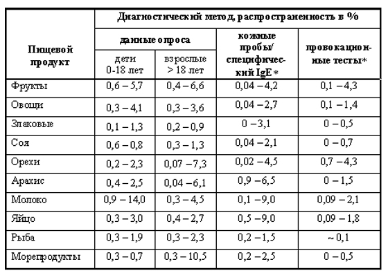 Для лучшего представления картины распространенности ПА к основным пищевым продуктам или их группам по анализируемым научным работам составлена табл. 1, в которой приведены данные опроса, кожных проб/специфического IgE и провокационных тестов (открытый или ДСПКПТ) в виде минимальных и максимальных значений распространенности, приведенных в публикациях.