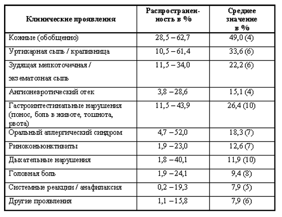 Распространенность клинических проявлений пищевой аллергии