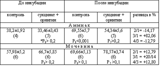 Проведенные нами исследования показали, что при совместном добавлении сукцината и орнитина к инкубационной среде не происходят выраженные сдвиги в синтезе мочевины (табл.1). Отмечается лишь тенденция к снижению свободного аммиака и повышению уровня мочевины. Известно, что при декапитации животных в различных тканях увеличивается содержание аммиака, при котором нарушаются биоэнергетические процессы [46], чем можно объяснить недостаточное окисление сукцината и образование АТФ, который необходим для синтеза мочевины.