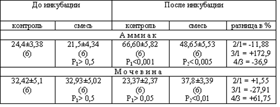 орнитином к инкубационной среде добавляли аминокислоты (цитруллин, ГК и Асп), непосредственно участвующие в синтезе мочевины. Как и в предыдущей серии (табл.1), при инкубировании гомогенатов печени резко увеличивалось образование аммиака из эндогенных источников. При добавлении к инкубационной среде указанной смеси четко уменьшалось образование аммиака из эндогенных источников по сравнению с инкубированным контролем (табл.2).