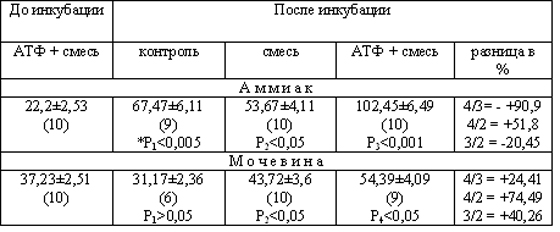 Учитывая нарушение энергетического обмена при гипераммонемическом синдроме [46] и необходимость АТФ для синтеза мочевины, мы в наших последующих экспериментах использовали АТФ. Так как исследования, проведенные нами в предыдущей серии, показали, что уровень свободного аммиака и мочевины в присутствии смеси без инкубации не отличается от уровня контроля, мы в следующей серии в качестве контроля без инкубации использовали пробы в её присутствии. Исследования показали, что в присутствии смеси содержание эндогенного аммиака при инкубировании чётко снижается. При добавлении к смеси АТФ содержание свободного аммиака резко повышается, что можно объяснить образованием аммиака из добавленного АТФ (табл.3).