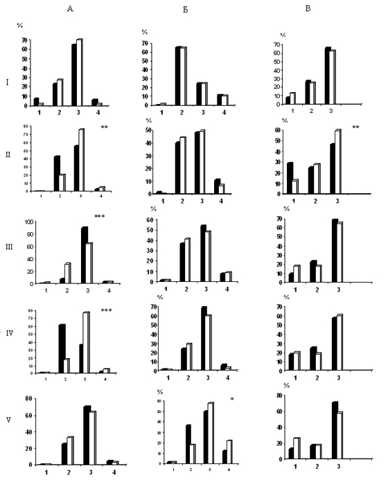 Рис. 1. Динамика относительных количеств нейронов верхнего вестибулярного ядра, которые генерируют фоновую импульсную активность, имеющую различную степень регулярности (А), динамический тип (Б) и модальность гистограмм межимпульсных интервалов (В): I – показатели интактных животных; II – через 2 дня после односторонней лабиринтэктомии, III-V – соответственно после 5, 10 и 15-дневного вибрационного воздействия с предварительной делабиринтацией. На А: 1 – регулярная, 2 – промежуточная по степени регулярности, 3 – нерегулярная, 4 – нестационарная фоновая активность; на Б: 1 – фоновая активность со случайной последовательностью межимпульсных интервалов, 2 – фоновая активность с локальным изменением частоты, 3 – пачечно-групповая фоновая активность, 4 – с монотонным изменением частоты разрядов; на В: 1 – моно-; 2 – би-; 3 –полимодальные гистограммы межимпульсных интервалов.
