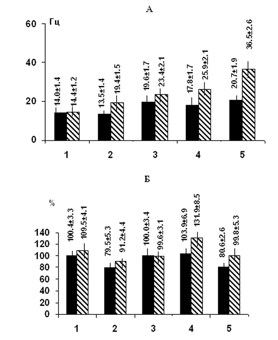 Рис. 2. Изменения показателей средней частоты (А) и коэффициента вариации (Б) нейронов верхних вестибулярных ядер в различные дни экспериментов: 1 – показатели интактных животных; 2 – через 2 дня после односторонней лабиринтэктомии, 3-5 – соответственно после 5, 10 и 15-дневного вибрационного воздействия с предварительной делабиринтацией.