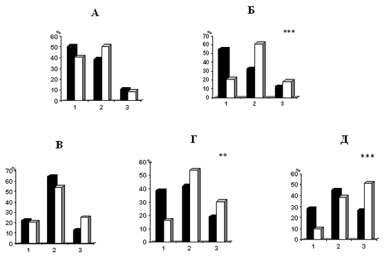 ** p‹0,05; *** p‹0,001; 1– низко-, 2 – средне-, 3 – высокочастотные нейроны.