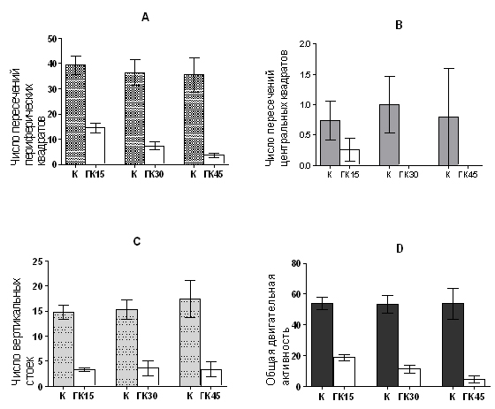 Литературные данные также указывают на то, что при моделировании ГК у экспериментальных животных регистрируется устойчивое снижение поведенческой активности [6,8-10].