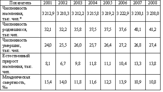 Литературные данные свидетельствуют [1-4, 6, 12], что в России с 1997 по 2007 гг. численность населения уменьшилась на 7,1 млн человек, смертность превышает показатель рождаемости в 1,3-1,5 раза (показатель смертности составляет 14,7‰), и соответственно отмечается естественная убыль населения (-3,4‰). С 1993 по 2008гг. население Украины также сократилось более чем на 5,8 млн человек. Положительный прирост населения отмечается лишь в немногих республиках, например, в Республике Дагестан (11,7‰), в Республике Казахстан (9,4‰).