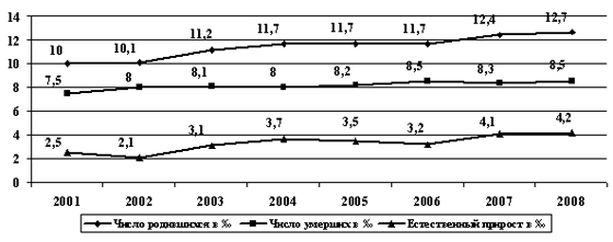 За период с 2001 по 2008гг. в Армении отмечается увеличение коэффициента как рождаемости (с 10 до 12,7‰), так и смертности (с 7,5 до 8,5‰), а естественный прирост колеблется с 2,5 до 4,2‰ (рис. 1). Вместе с тем в Армении отмечается отрицательная сальдо миграция (с -3,2 до -2,0), которая негативно влияет на качество населения и ситуацию на рынке труда.
