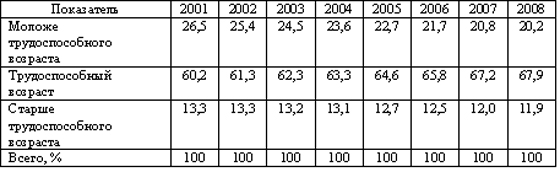 Среди неблагоприятных тенденций демографических изменений, влияющих на формирование ее трудового потенциала, отмечается сокращение доли населения в возрасте моложе трудоспособного и рост доли лиц пенсионного возраста. В 2008г. в трудоспособном возрасте (от 16 до 62 лет – для мужчин и от 16 до 60 лет – для женщин) в Армении оказалось 2198600 человек, а старше трудоспособного возраста – 385500 человек. С 2001 по 2008 гг. в численности постоянного населения четко прослеживается снижение доли населения младше трудоспособного возраста с 26,5 до 20,2% (табл. 2), увеличение доли трудоспособного возраста с 60,2 до 67,9% и небольшое снижение доли населения старше трудоспособного возраста (с 13,3 до 11,9%).