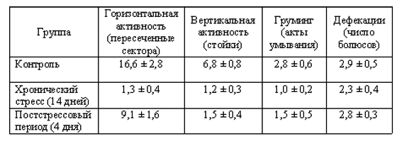Поведенческие реакции крыс: локомоторная, ориентировочно-исследовательская активность и эмоциональное состояние оценивали тестированием в ОП и ПКЛ. Животных отбирали на основе предварительного тестирования в ОП и ПКЛ так, чтобы они значимо не различались по двигательной активности и уровню тревожности и характеризовались средним уровнем активности. В конце двухнедельного стрессирующего воздействия у подопытных крыс, по данным тестирования в ОП и ПКЛ, наблюдались моторная и эмоционально-поведенческая заторможенность (табл. 1, 2). Зарегистрированы достоверное снижение показателей двигательной активности, более чем на порядок, числа стоек в 5,6 раза, груминга в 2,8 раза, входы в открытые рукава лабиринта сократились в 8 раз, а свешиваний с них – в 9 раз.