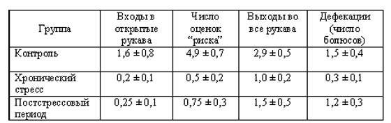 Тест “приподнятый крестообразный лабиринт” (ПКЛ). Тест проводили в крестообразном лабиринте, приподнятом над полом на 80 см и имеющем два закрытых (со стенками) и два открытых (без стенок) рукава длиной 45 и шириной 10 см (высота стенок в закрытых рукавах 10 см). В центре расположенных крест-накрест рукавов лабиринта находилась открытая площадка (размером 10 х 10 см). Крысу помещали в центр лабиринта и в течение первых 5 мин наблюдения регистрировали число заходов в открытые и закрытые рукава лабиринта, а также число оценок “риска” (число свешиваний с открытых рукавов лабиринта) [8].
