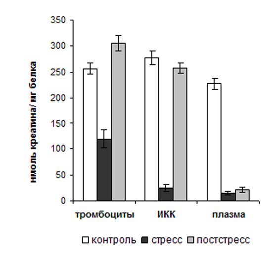 превышая в последних контрольный уровень. В то же время после ХС концентрация креатина плазмы крови драматически снижается, в 15 раз по сравнению с контролем, и лишь слегка возрастает через 4 дня постстрессового периода. Все это свидетельствует о метаболических пертурбациях энергетического метаболизма на периферии и существовании компенсаторных механизмов, которые по-разному проявляются в ИКК, тромбоцитах и плазме крови.