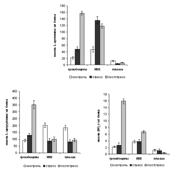 Как видно из рис. 2, ХС вызывает повышение уровня аргинина, цитруллина и АФА в тромбоцитах, которое наиболее выражено в постстрессовый период. Особенно это проявляется в отношении АФА, содержание которых сразу после стресса лишь незначительно возрастало и в тромбоцитах, и в ИКК, но уже через 4 дня после ХС в них одновременно повышались уровень АФА в 7,3 и 1,8 раза и аргинина в 7,2 и 2,5 раза (по сравнению с контролем) соответственно. В то же время в ИКК и плазме крови вдвое падает содержание цитруллина. Экзогенный цитруллин в высоких концентрациях ингибирует поглощение аргинина альвеолярными макрофагами крыс [24]. Не исключено, что эндогенный цитруллин также оказывает влияние на процессы поглощения аргинина клетками крови и регулирует его уровень в них, что особенно проявляется в отношении ИКК. Кроме того, аргининсукцинат синтаза и аргининсукцинатлиаза осуществляют рециклизацию цитруллина в аргинин, обеспечивая автономное снабжение субстратом NO синтазы, и эти ферменты цикла цитруллин NO представлены практически во всех органах и тканях [37]. Вероятно, при ХС происходит активирование вышеуказанных метаболических процессов, при этом в ИКК крови отрицательная корреляция между сдвигами в них содержания аргинина и концентрации цитруллина в плазме весьма высока (r=-0,9969, p=0,05), та же тенденция, но в меньшей степени наблюдается и в тромбоцитах (r=-0,5679, p=0,05).