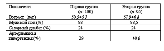 Обследовано 196 больных (173 мужчин) с первичным острым ИМ ЛЖ с элевацией сегмента ST нижней локализации, поступивших в отделение неотложной кардиологии МЦ “Эребуни”в течение 12 часов от начала клинических проявлений острого ИМ, в возрасте от 38 до 72 лет.Из исследования исключены больные с ревматическими пороками сердца, хронической почечной недостаточностью, нарушением мозгового кровообращения, печеночной недостаточностью.В течение первых 24 часов острого ИМ всем больным произведена ЭхоКГ аппаратом G65 фирмы “Siemens” (Германия). Определены ФВ ЛЖ (по методу Симпсона), ССТК.ССТК определялось в М-режиме ЭхоКГ,курсор которого направлялся от верхушки к латеральной части трикуспидального кольца. В зависимости от значения ССТК все больные распределены в две группы:в первую группу вошли больные со ССТК ≤ 14мм (100 больных), во вторую – со ССТК ≥14мм (96 больных).Клиническая характеристика больных между группами не различалась (табл. 1). Больные наблюдались нами в стационаре в течение двух недель. В конце госпитального периода лечения (12-14-й день ИМ) все выжившие больные прошли тредмил-тест (ТТ) по модифицированной методике Брюса на аппарате марки “Quinton-3000” (США).Определялись следующие параметры:продолжительность нагрузки (ПН),время появления депрессии сегмента ST (ВДST), время появления стенокардии (ВС).