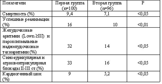 ФВ ЛЖ между группами достоверно не различалась,однако, как видно из табл. 2, госпитальная смертность в первой группе составила 9,4%, а во второй – 7,1% (Р‹0,05).Частота случаев успешной реанимации также была выше в первой группе.Серьезные желудочковые аритмии (Lown ≥ III), пароксизмальная и персистирующая аритмии в первой группе зарегистрированы в 32%,во второй – 14% случаев (Р‹0,05). Атриовентрикулярная или синоаурикулярная блокады II-III степени достоверно чаще встречались у больных со ССТК≤14мм. Случаев кардиогенного шока также больше зарегистрировано в первой группе, несмотря на отсутствие разницы в сократимости миокарда ЛЖ между группами.