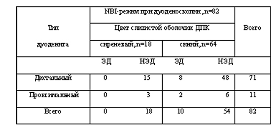 При сопоставлении результатов эндоскопической картины в NBI- и обычном режиме установлено, что при использовании NBI-методики диагностировался преимущественно дистальный дуоденит, выявленный у 71 больного из 82, а при обычном режиме у большинства больных (67) визуальные признаки воспаления отмечены преимущественно в проксимальных отделах (бульбит, верхняя горизонтальная область).