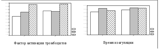 Изменения показателей фактора активации тромбоцитов (ФАТ), АЧТВ, МНО, эуглобулинового лизиса, по сравнению с контрольными величинами, являются статистически недостоверными, т.е находятся в пределах контрольных величин.