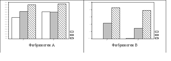 Если в дооперационный период, а также у здоровых лиц фибриноген В почти не обнаруживается, то в постоперационные сроки исследования у пациентов обеих групп, и особенно у представителей первой группы, он достигает уровня 8 единиц, что, несомненно, свидетельствует о возможном развитии патологического процесса (инфекционного, воспалительного и аутоиммунного) или подострого и/или хронического ДВС-синдрома (рис. 3).