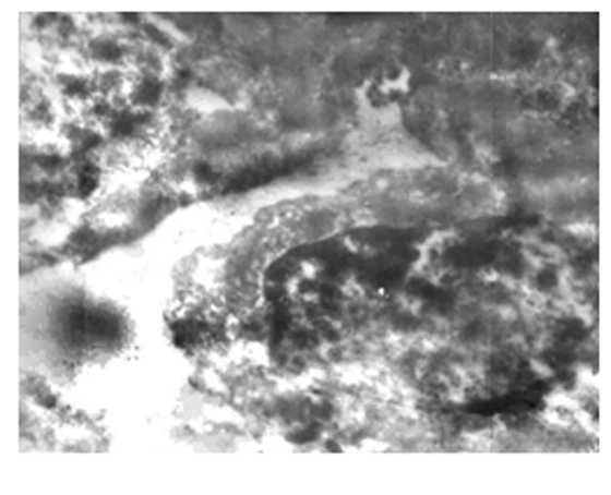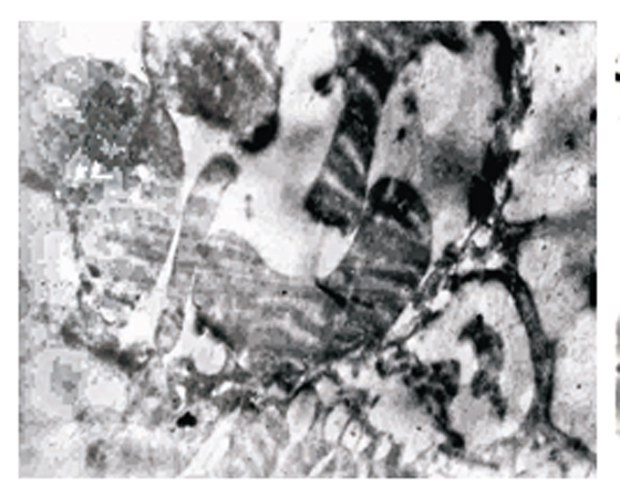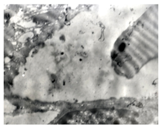 Структурные изменения почки белых крыс обусловлены как выбросом катехоламинов в период 2 ч компрессии в ответ на боль и стресс, так и группой токсических пептидов, образовавшихся в результате протеолиза миоглобина в ишемизированной мышце в период компрессии и выброшенных в кровь в период декомпрессии. Как известно, пептиды, образованные в ишемизированной мышце, являются крайне токсичными и с попаданием в кровяное русло в результате реперфузии вызывают ряд серьезных нарушений. К числу последних относятся серьезные нарушения в микроциркуляции крови, в результате чего развивается гипоксия и , как следствие последней, ишемия различных тканей и органов. Как показали результаты наших исследований, ультраструктурные изменения почки крыс при 4ч декомпрессии имеют следующий характер: просвет капилляров нефрона расширен с явными признаками полнокровия, эритроциты находятся в процессе агрегации, наблюдается вариация их форм (рис.2а). Имеет место выраженный отек, а также разрушение цитотрабекул клетки дистального отдела нефрона (рис.2б). Наряду с перечисленными ультраструктурными изменениями необходимо отметить наличие планктонных форм и микроколонии грамотрицательных бактерий в дистальном отделе нефрона (рис.2 в).
