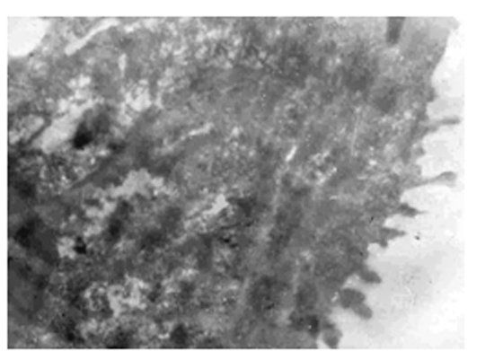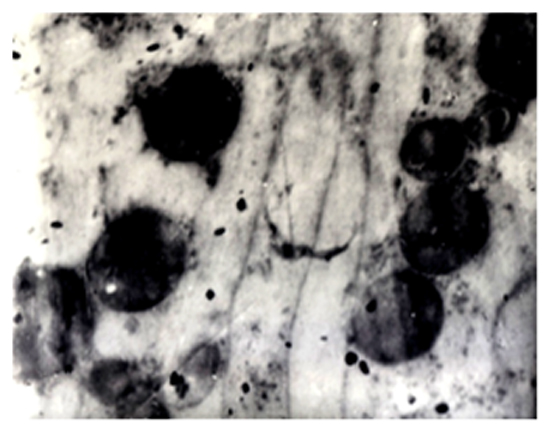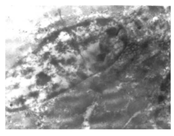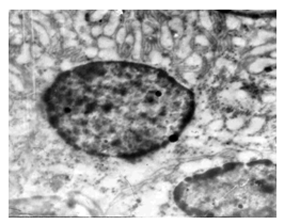 Биоптаты почек крыс, взятые непосредственно после декапитации животных, были подвергнуты обработке в целях трансмиссионного электронномикроскопического исследования по следующей схеме: 1–обработка (префиксация в смеси альдегидов: параформальдегид-глутаральдегид по методике [22]; постфиксация с помощью 2 % раствора четырехокиси осмия на какодилатном буфере не менее 1 ч; обезвоживание биообразцов проводилось в восходящем ряду этанола и ацетона, с последующей заливкой смесью эпоксидных смол и полимеризацией при 60º С в течение 48 ч; 2–ультрамикротомирование – получение ультратонких срезов в целях трансмиссионной электронной микроскопии осуществлялось на ультратоме “Reichard” (Австрия); 3–контрастирование–ультратонкие срезы, полученные на ультратоме контрастировали спиртовым раствором уранил ацетата и лимоннокислым свинцом по Рейнолдс [30]; 4–просмотр и съемка проводились под электронным микрос-копом фирмы “TESLA – BS 500” (Чехословакия).