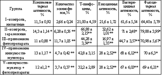 Фитоантигельминтный препарат существенно снижал интенсив-ность инвазии и показатели неспецифического иммунитета (таблица).