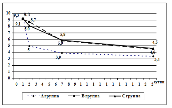 Достоверное понижение величин С-РБ на 7-е сутки наблюдалось во всех группах больных. Важно отметить, что у 75% больных в группе А отмечалось достоверное уменьшение концентрации С-РБ в конце 1-х суток до 5.0 мг/л, в то время как в группах В и C достоверная динамика наблюдалась лишь с 7-го дня, соответственно до 5.9 и 5.8 мг/л. Положительная динамика показателей С-РБ наблюдалась и на 17-21-й дни заболевания с наилучшими результатами в группе А.