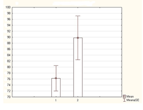 Рис. 1. Усредненные показатели амплитуды индуцированного адреналином (10-5 М) сокращения аортальных колец интактных крыс до (1) и после (2) добавления в инкубационную среду ПТГ(10-10 М)