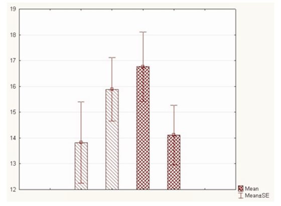 Вместе с тем наблюдалось удлинение сократительных эффектов изолированных колец аорты в ответ на введение адреналина до 15.88 ± 1.23 мин против 13.8±1.58 мин в контроле (р›0.05) и укорочение расслабительных эффектов изолированных колец аорты в ответ на введение папаверина до 14.12 ± 1.15мин против 16.76± 1.35 мин в контроле ( р‹ 0.05) (рис. 3).