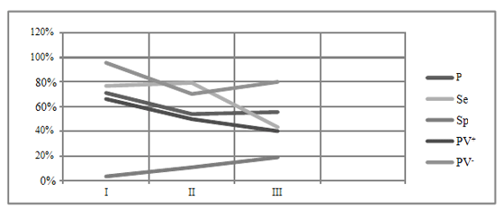 Статистические расчеты показали, что значение Se в I группе исследования соответствовало 76,9%, во II – 78,2% и в III – 42,7%. При анализе Sp результаты распределились в диаметрально про-тивоположной зависимости: был определен низкий уровень для I группы – 2,3%, однако незначительно выше для II – 10,7% и наиболее высокий для III – 18,6%. С целью сравнения информативности Se и Sp был рассчитан IS, характеризующий диагностические свойства вышеуказанных показателей. На их высокую информативность указывает значение IS=1. Полученное в представленном исследовании значение IS для I группы составляло 29,6; для II – 7,3 и для III – 2,3. Дальнейший анализ показал следующие значения PV+: I группа исследования – 65,6%; II – 50,3% и III – 40,2%. Однако при расчете PV– для I группы был характерен уровень 95,6%, для II –70,3% и для III группы – 79,7%. Клинический опыт показал, что информативность результатов статистического анализа зависит от Р, которая по полученным данным в I группе достигала 71%; вo II – 54% и в III группе – 56%. Полученные результаты представлены ниже (рис. 1).