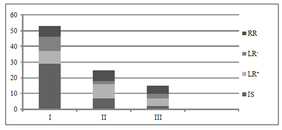 При расчете RR во время госпитализации пациентов в отделении, в I и II группах были получены равнозначные значения – 0,7, однако в III группе – 0,5. Кроме того, при расчете LR+ в I группе – 0,8, во II – 0,9 и в III – 0,5. В свою очередь LR– была значительно вы-ше в I группе – 8,9, во II группе – 2,1; в III – 3,1 (рис.2).