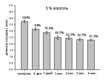 При алкоголизации 10% этиловым спиртом сужение просвета капилляров носило переменный характер. Наиболее выраженный спазм сосудов приходился на 7-е сутки, когда диаметр сосудов уменьшился до 2.57 мкм (табл.), что соответствует 68.4% по сравнению с контролем (рис.3). Далее наблюдалось постепенное расширение диаметра капилляров до 3.05мкм, (81% через 3 месяца) с последующим сужением до 2.67 мкм (71%) на 5-м месяце. Так, уменьшение диаметра сосудов при 10% алкоголизации через 5 месяцев наблюдения по сравнению с контролем составило 29% (рис. 3).