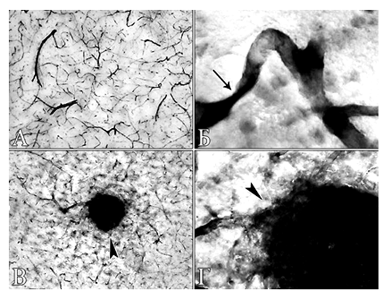 По полученным результатам, благодаря избирательному осаждению коричневого осадка фосфата свинца на эндотелии сосудов обеспечивалось избирательное, четкое и контрастное выявление микроциркуляторного русла мозга: артериол, венул и капилляров (рис. 1А).