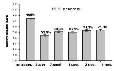 При исследованиях с 15% этиловым спиртом первой реакцией на введение алкоголя явилось резкое сужение просвета капилляров на третьи сутки до 2.25 мкм (59.9%) с последующей умеренной дилатацией сосудов до 2.7 мкм (71.9%) (рис. 4), что можно, скорее всего, интерпретировать за счет адаптативно-компенсаторного механизма, срабатывающего при высоких концентрациях этанола.