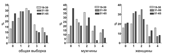 Среди 408 обследованных признаки скрытого левшества выявлены у 336 респондентов (82,4%), при этом респонденты с одним признаком составляли 26,0%, с двумя - 30,4%, с тремя - 14,0%, с четырьмя - 12,0%. При изучении возрастной динамики распределения лиц с различным числом признаков скрытого левшества как в общей выборке, так и в гендерном разрезе, выявлена тенденция прогрессирующего увеличения с возрастом, особенно, у лиц среднего (31-50 лет) и пожилого (51-65 лет) возраста, числа лиц, как без признаков скрытого левшества, так и с одним признаком. Одновременно отмечается прогрессирующее уменьшение числа респондентов с двумя и более признаками скрытого левшества (рис. 1).