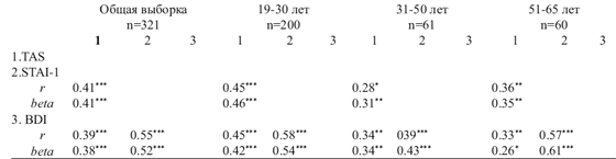 Хотя взаимосвязь между алекситимией, тревогой и депрессией в норме и при различных патологических состояниях продолжает привлекать внимание исследователей, остается открытым вопрос количественной оценки их ассоциирования, особенно в возрастном и гендерном аспектах. Выявление у обследуемых лиц различных возрастных групп возрастной трансформации со стороны некоторых личностных характеристик, на фоне практически неизменности других, послужило основанием для изучения их взаимосвязи. Изучение корреляции между исследуемыми показателями, проведенное с помощью непараметрических критериев подтвердило данные, полученные при использовании модели множественной линейной регрессии, относительно изменения с возрастом силы корреляции изучаемых показателей эмоционально-личностной сферы респондентов (табл.2).