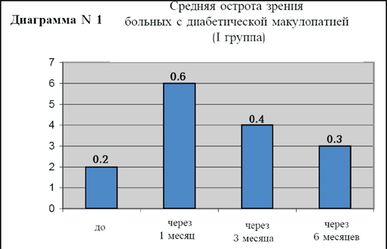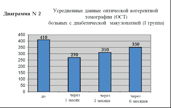 Частота повторных инъекций составила 65%. В группе пациентов с диабетической ретинопатией (I группа) средний исходный уровень остроты зрения с коррекцией составил 0.2 (диаграмма N1). Через 1 месяц он улучшился до 0.6, через 3 месяца острота зрения составила 0.4, а через 6 месяцев 0.3. Исходная толщина фовеальной зоны сетчатки у этих больных (диаграмма N2) в среднем составила 410 мкм, через 1 месяц 270 мкм, через 3 месяца 310 мкм, а через 6 месяцев 350 мкм.