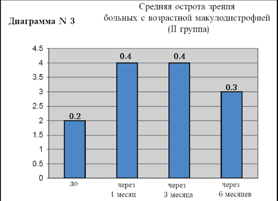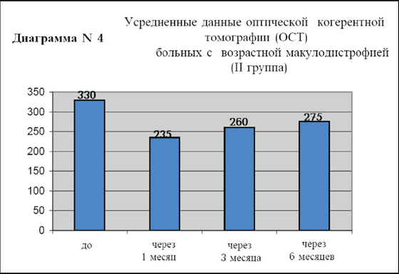 В группе пациентов с возрастной экссудативной макулодистрофией (II группа) средний исходный уровень остроты зрения с коррекцией составил 0.2, через 1 месяц 0.4, через 3 месяца острота зрения осталась прежней 0.4 и через 6 месяцев острота зрения составила 0.3 (диаграмма N3). Исходная толщина фовеальной зоны сетчатки у этой группы больных (диаграмма N4) в среднем составила 330 мкм, через 1месяц 235 мкм, через 3 месяца 260 мкм, а через 6 месяцев 275 мкм.