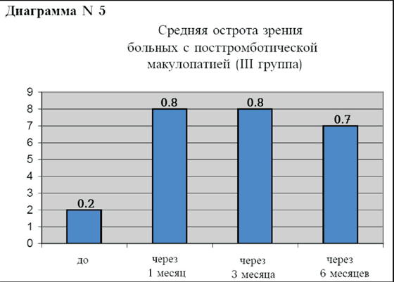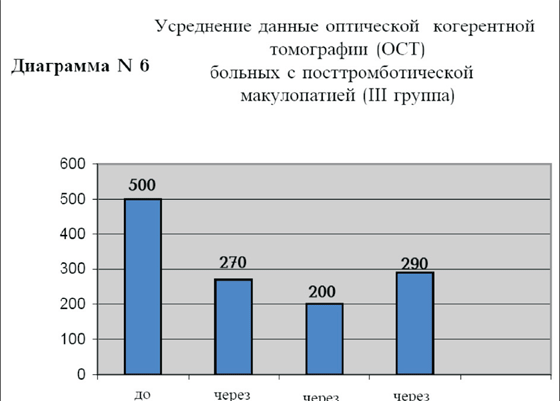 И наконец, в III группе больных с посттромботической макулопатией исходный средний уровень остроты зрения с коррекцией составил 0.2, через 1 месяц 0.8, через 3 месяца острота зрения снова 0.8 и через 6 месяцев острота зрения составила 0.7 (диаграмма N5). Исходная толщина фовеальной зоны сетчатки у этой группы больных (диаграмма N6) в среднем составила 500 мкм, через 1 месяц после инъекции 270 мкм, через 3 месяца 200 мкм, а через 6 месяцев 290 мкм.