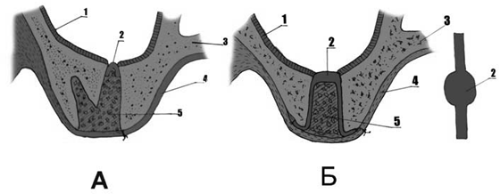 Второй способ - если отверстие на альвеолярном отростке было широким, высота альвеолярного отростка 5мм и более, в этом случае формировалась круглая мембрана, которая имела по бокам 2 ленточки. Круглая часть мембраны по своему размеру должна превышать размер отверстия примерно на 1-1,5мм. После формирования мембраны ее осторожно вводили в лунку до уровня дна лунки. Ленточкам придавали горизонтальное положение и пальцами левой руки плотно фиксировали по бокам отверстия. Свободное пространство до уровня гребня альвео-лярного отростка заполняли размельченным АДКМ в комбинации с БоТП (схема 1Б)