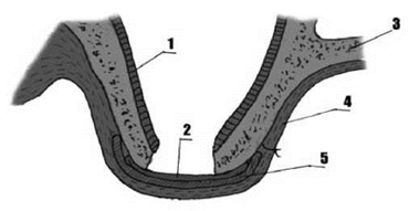1) слизистая оболочка ВЧП, 2) мембрана из пчелиного воска, 3) костная тканъ ВЧ и алъвеолярного отростка, 4) слизисто-надкостничный слой, 5) АДКМ
