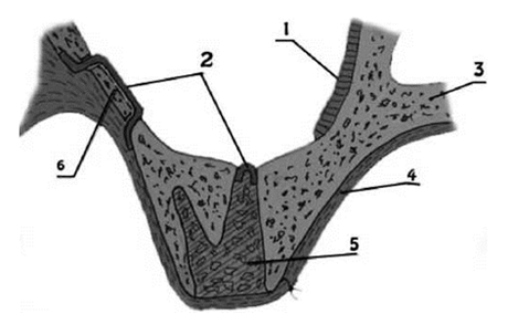 1) неизмененный участок слизистой оболочки ВЧП, 2) мембрана из пчелиного воска, 3) костная ткань ВЧ и альвеолярного отростка, 4) слизисто-надкостничный слой, 5) АКДМв комбинации с БоТП, 6) фрагмент костной ткани переднебоковой стенки ВЧП