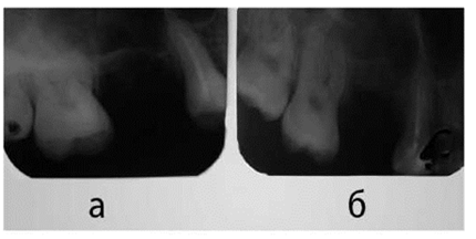 Рис. 2. Внутриротовая рентгенограмма альвеолярного отростка верхней челюсти справа:
