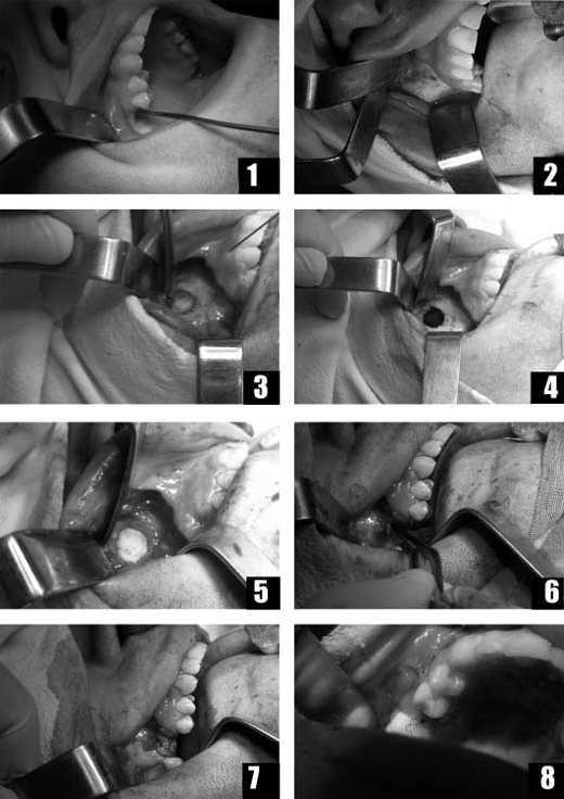 созданное соустье. Окно на переднебоковой стенке ВЧП закрывали мембраной из пчелиного воска, на которой был фиксирован фрагмент кости переднебоковой стенки ВЧП (рис 3.5). Дно лунки удаленного зуба закрывалось мембраной из пчелиного воска (рис 3.6). Лунку, до уровня гребня альвеолярного отростка, заполняли размельчённым АДКМ в комбинации с БоТП (рис 3.7). С целью наибольшей мобилизации, у основания формированного лоскута, рассекали надкостницу. Сформированным лоскутом закрывали лунку. Рану в полости рта зашивали наглухо (рис 3.8). Тампон из гайморовой пазухи удаляли на вторые сутки после операции, а швы -на 8-ые сутки. Рана зажила первичным натяжением. Больной выписан из больницы на 10-ые сутки после операции.