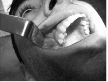 Больной Г. 20 лет, обратился в клинику с жалобами на наличие сообщения полости рта и носа после удаления 16-ого зуба 3 месяца назад. При объективном осмотре больного со стороны внутренних органов отклонений от нормы не выявлено. При осмотре полости рта выявлен свищевой ход в области лунки 16-ого зуба, через который ротовая полость сообщалась с гайморовой пазухой (рис 3.1). Выделение гноя из носа со стороны гайморовой пазухи не определялось. На рентгенограмме в носолобной проекции вы-являлось правостороннее затемнение ВЧП (рис 1А). На внутриротовой рентгенограмме альвеолярного отростка верхней челюсти справа лунка 16-ого зуба сообщается с ВЧП (рис 2а). На основании клиникорентгенологических исследований диагностирован правосторонний перфоративный гайморит. Под общим обезболиванием произведена радикальная опера-ция ВЧП, с пластическим закрытием ороантрального сообщения. Предварительно освежали края лунки 16-ого зуба, затем проводили радикальную гайморотомию.